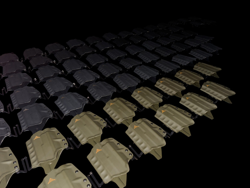 Všechna pouzdra jsou vyráběna z 2mm kydexu dle vlastního návrhu – bez potřeby výztuh či žebrování. Jsou dostupná v pravé i levé variantě, včetně zakázkových barev.